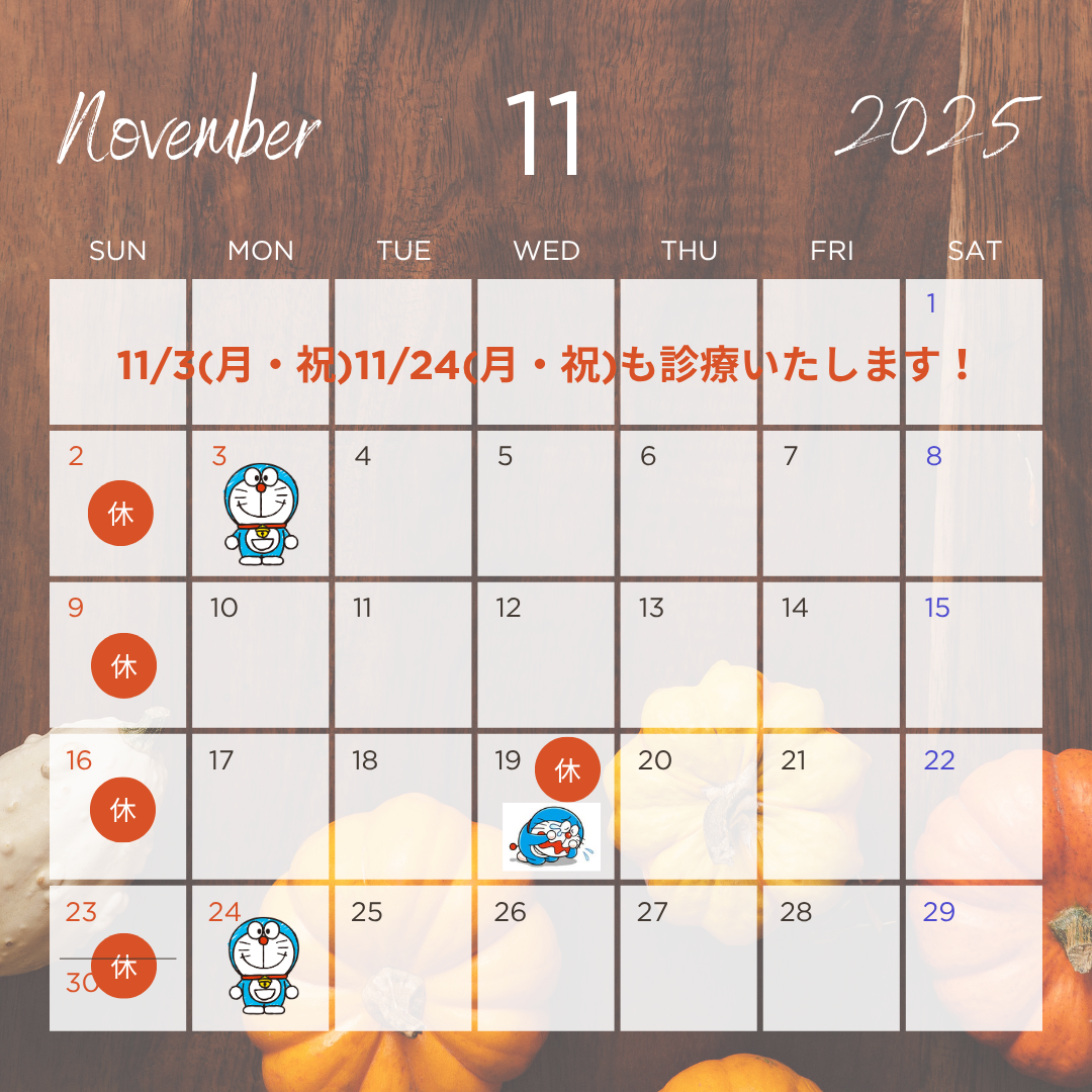11/3(祝)、11/24(祝)は、9:00-17:00で診療します。11/19(水)は、臨時休診とさせて頂きます。院長。