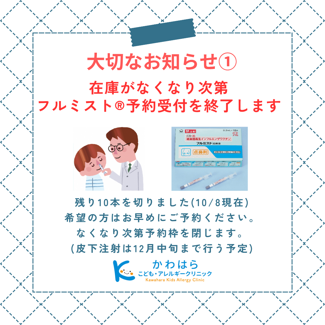 フルミストワクチンはなくなり次第、予約枠を閉じさせていただきます。